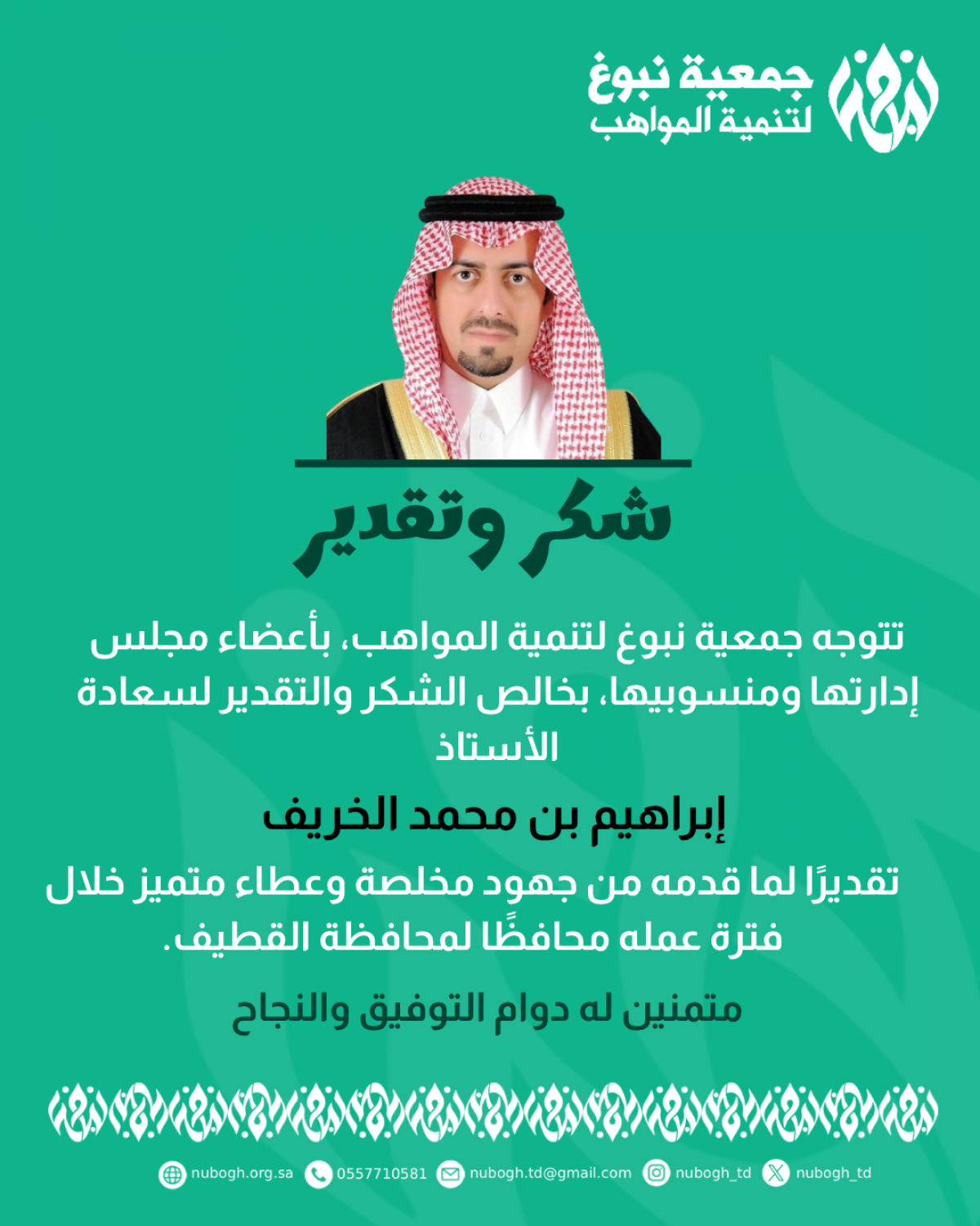 شكر وتقدير لسعادة الأستاذ إبراهيم بن محمد الخريف