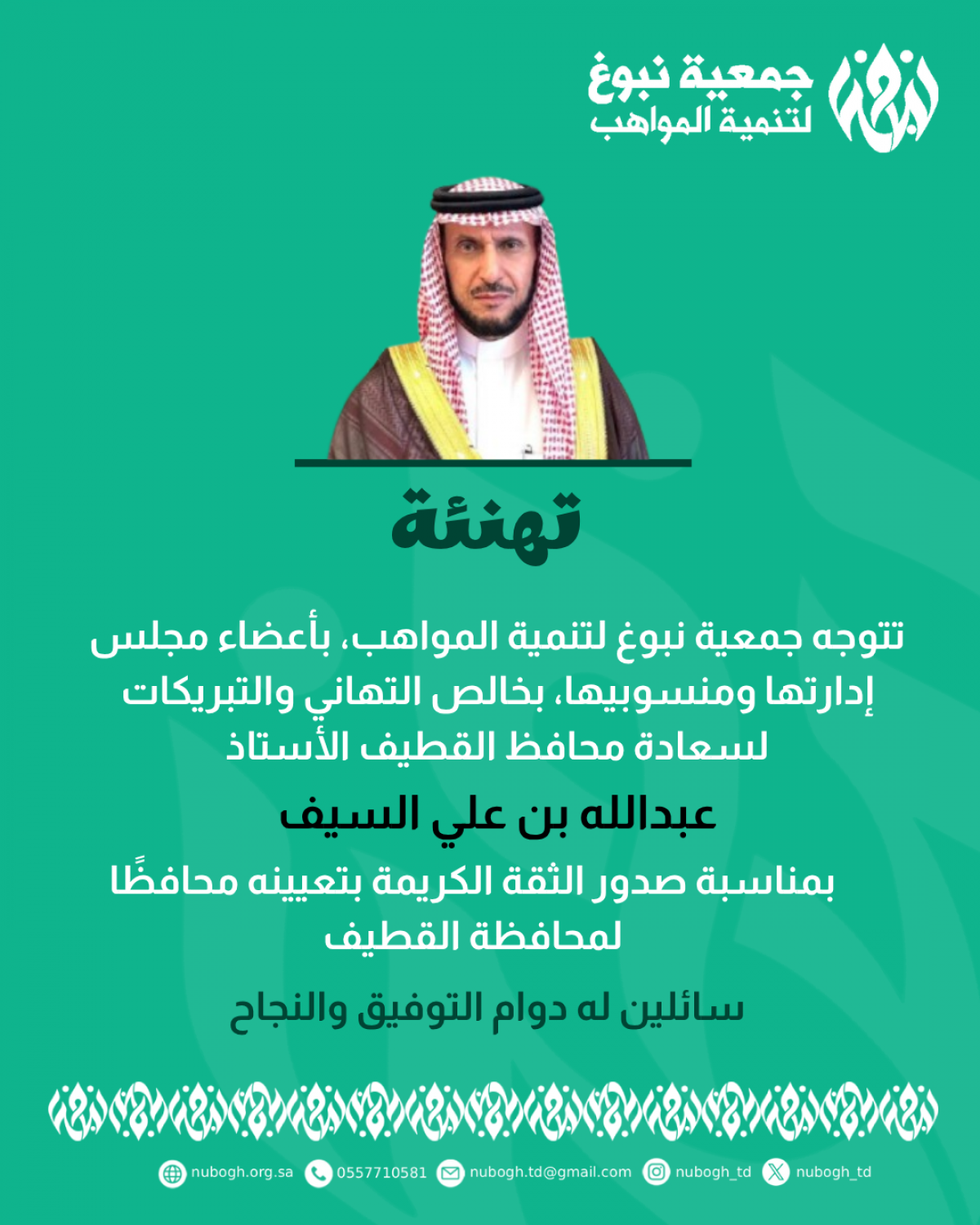 تهنئة سعادة محافظ القطيف الأستاذ عبدالله بن علي السيف